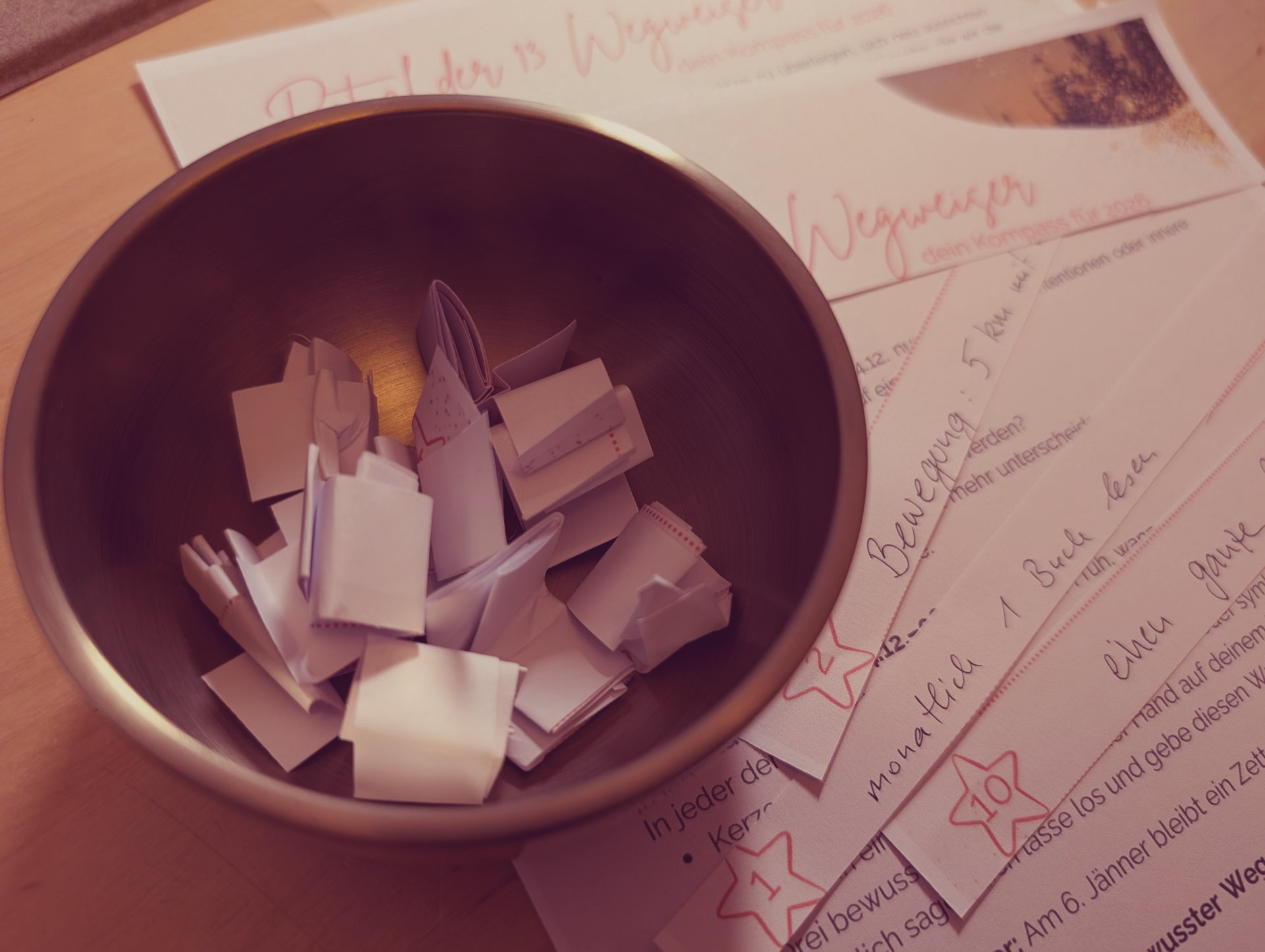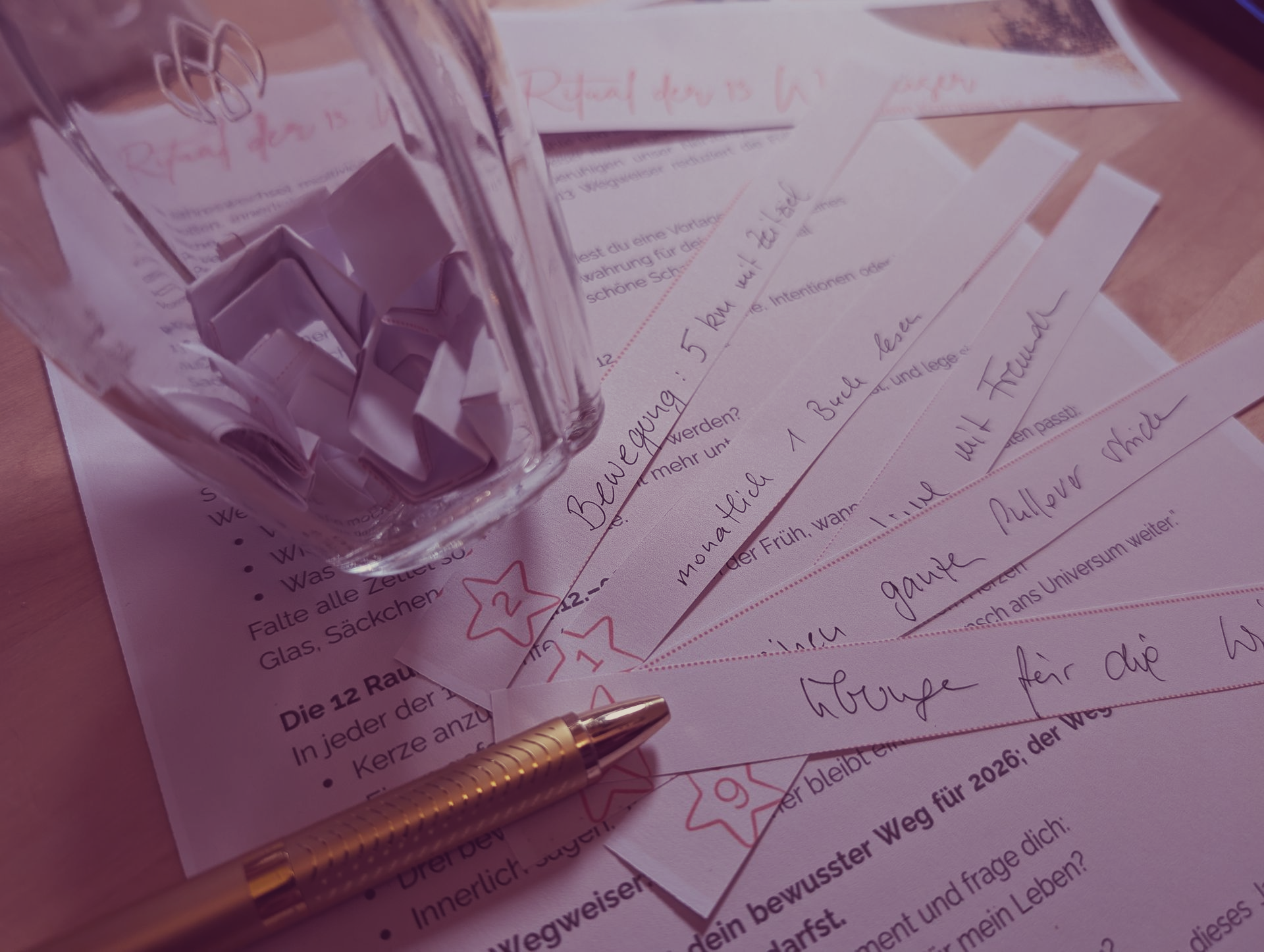 Das traditionelle Ritual stammt aus den Raunächten: Man schreibt 13 Wünsche auf, verbrennt 12 davon und behält einen Wunsch zurück. Ich habe dieses Ritual für mich modernisiert, psychologisch übersetzt und nenne es heute: